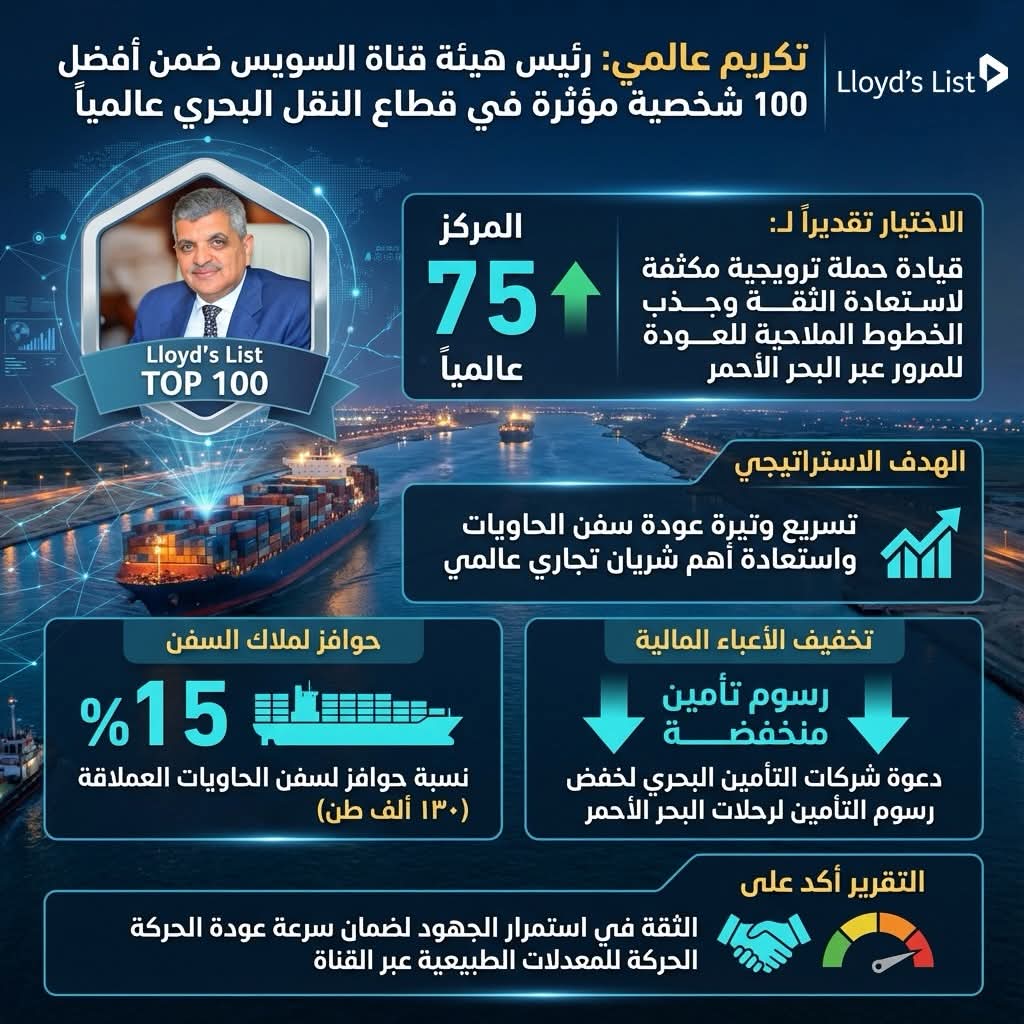 إن إدراج أسامة ربيع ضمن قائمة المئة شخصية الأكثر تأثيراً في القطاع البحري لا يمثل مجرد تقدير شخصي، بل هو أيضاً تأكيد على أهمية مصر وقناة السويس في ميزان التجارة العالمية. إشارة واضحة إلى أن القناة، رغم الأزمات، لا تزال شرياناً حيوياً لا غنى عنه للاقتصاد العالمي.