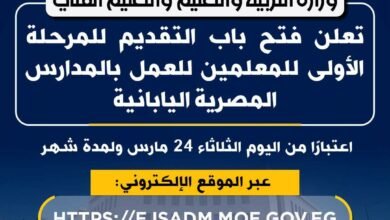 وزارة التعليم تعلن فتح باب التقديم للمرحلة الأولى للمعلمين للعمل بالمدارس المصرية اليابانية اعتبارًا من اليوم الثلاثاء 24 مارس ولمدة…