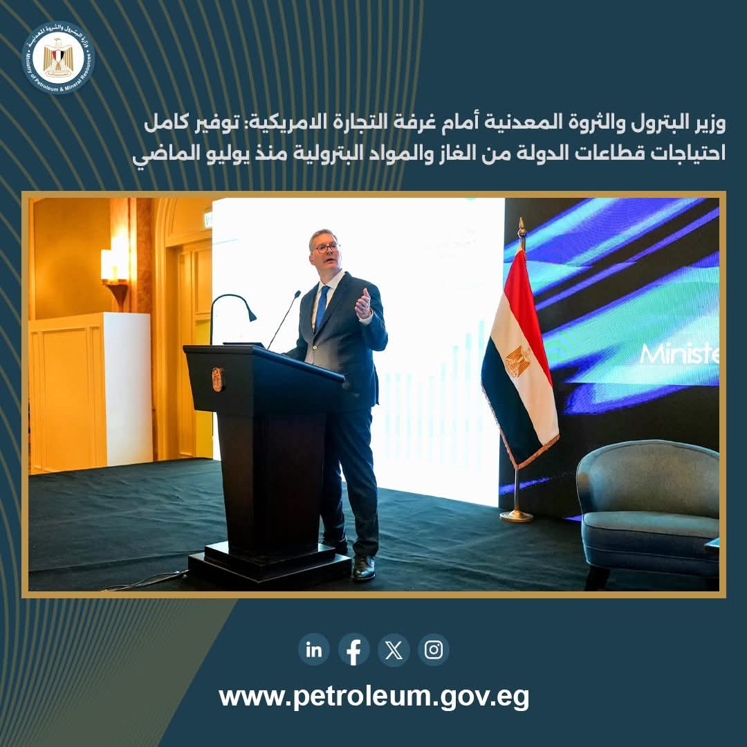 واختتم الوزير كلمته بتوجيه الشكر لغرفة التجارة الأمريكية على دورها الإيجابي في دفع التعاون بين مختلف الأطراف الفاعلة في الصناعة، وجميع شركاء النجاح من الشركات العالمية والمحلية، مثمناً الدور الحيوي الذي يقوم به العاملون في قطاع البترول والتعدين الذين يمثلون الركيزة الأساسية لتحقيق هذه الاستراتيجية الطموحة، ومؤكداً أن تضافر الجهود بين الدولة والقطاع الخاص هو الضمانة الحقيقية لتحقيق الازدهار وتأمين مستقبل الطاقة في مصر.